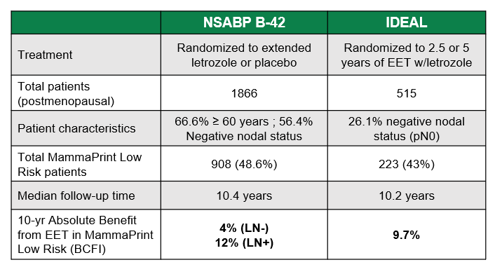 Together, the prospective, randomized NSABP B-42 and IDEAL trials demonstrate Level 1B evidence that patients with MammaPrint Low Risk benefit from extended endocrine therapy.