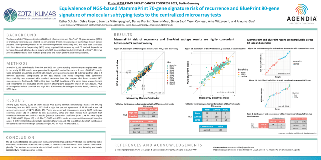 The CE marked targeted NGS version of the MammaPrint 70GS and BluePrint 80GS test confirmed to be equivalent to the centralized microarray test, as demonstrated by results from various laboratories globally. This enables an accurate decentralized solution to breast cancer care fostering worldwide accessibility to reliable genomic testing.